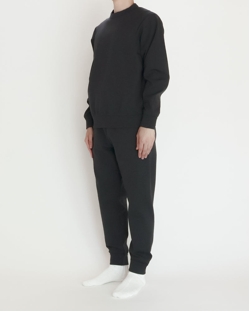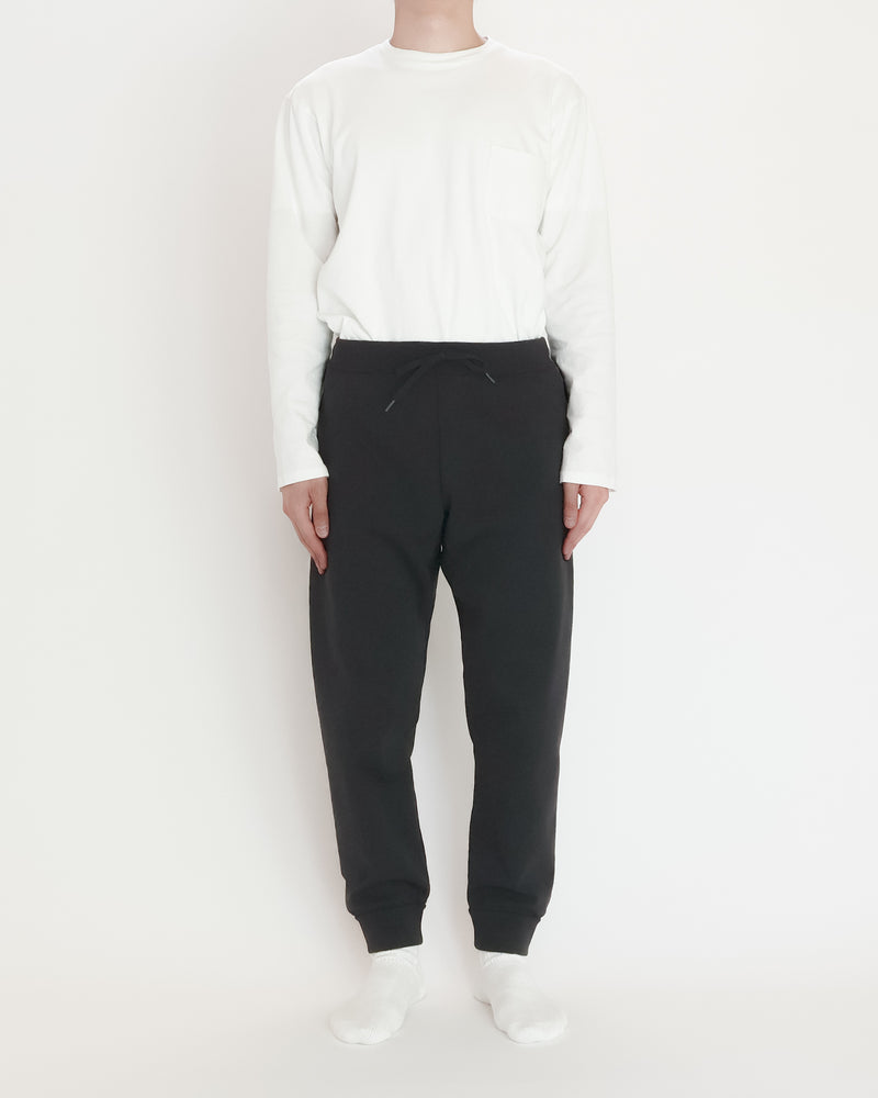 キックバック性の高いナイロンの糸を先染めして、高密度に編み上げた生地で作りました。テーパードシルエットのイージーパンツです。