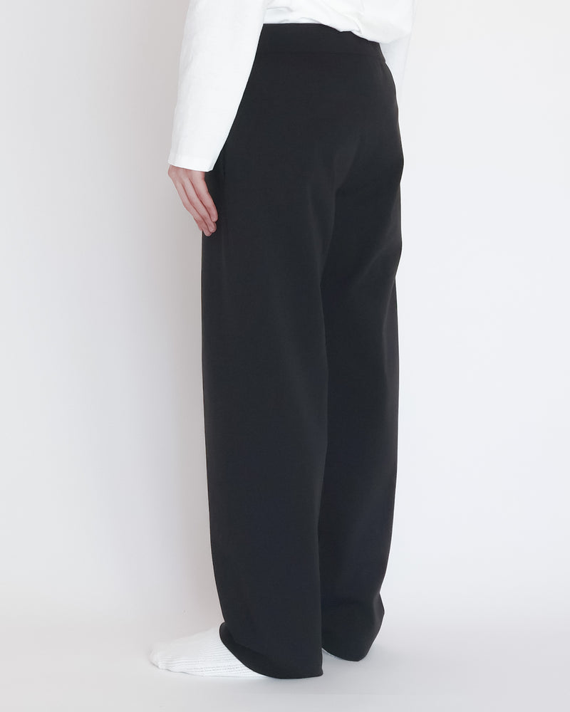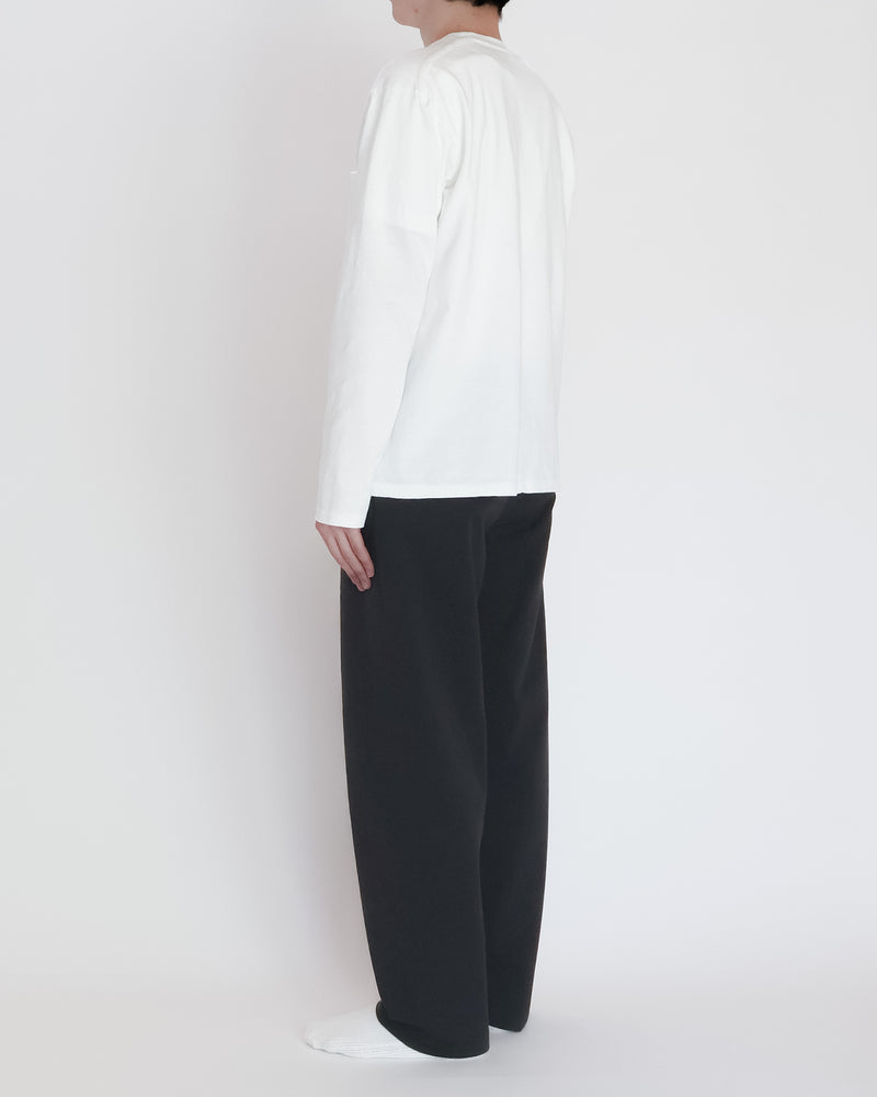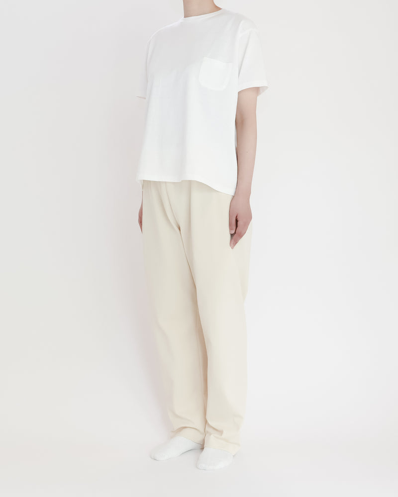 キックバック性の高いナイロンの糸を先染めして、高密度に編み上げた生地で作りました。やや太めのストレートシルエットのイージーパンツです。